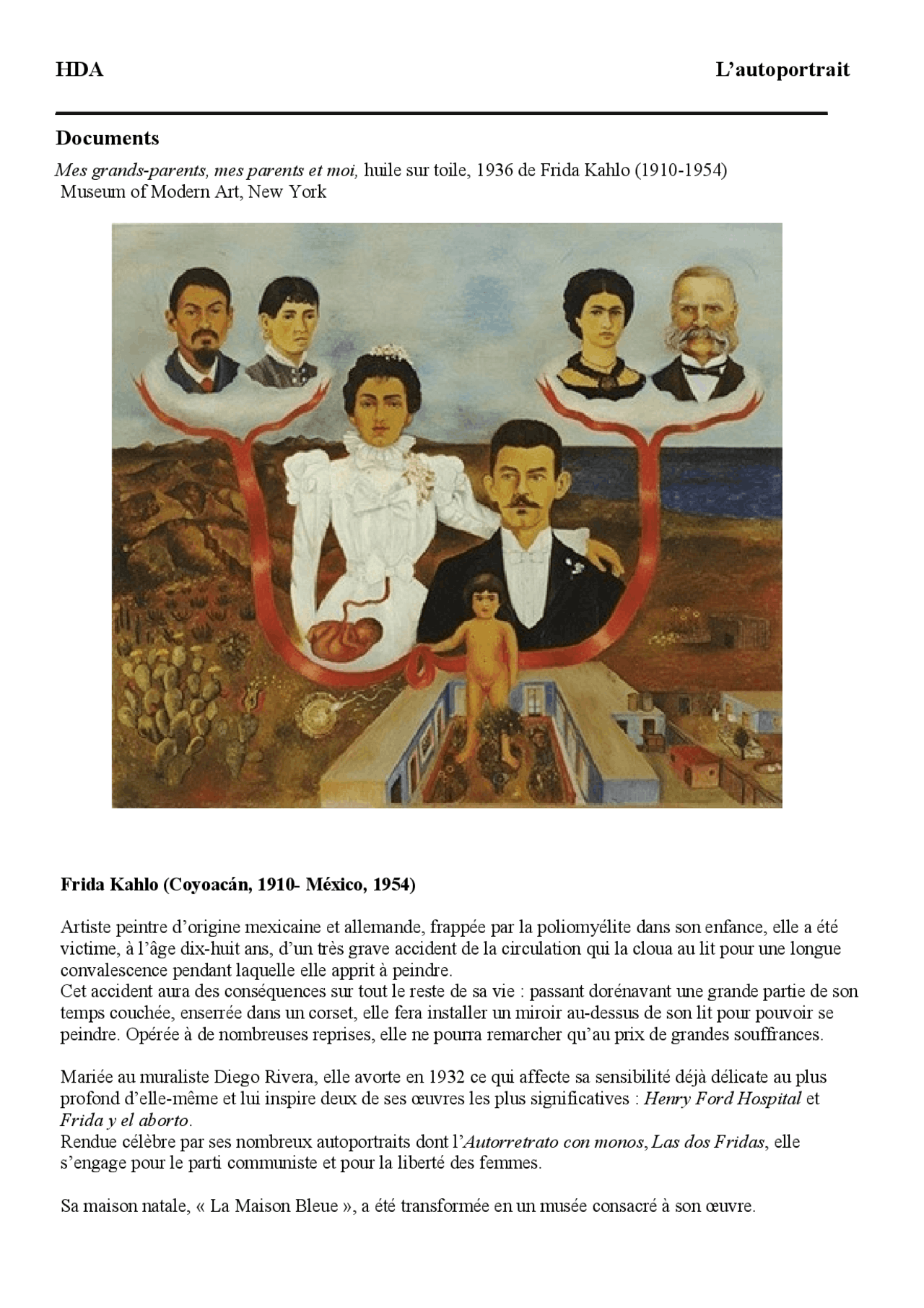 Mes Parents, mes grands-parents et moi. Domaine artistique : Peinture (huileet tempera sur métal)Courant artistique : Art naïf, art populaire et surréalismeArtiste : Frida KahloDate de création : 1936Lieu de création : Mexico, MexiqueLieu d'exposition : Museun of Modern Art, New York, États-UnisDimensions : 30,7 x 34,5 cm. L'œuvre.