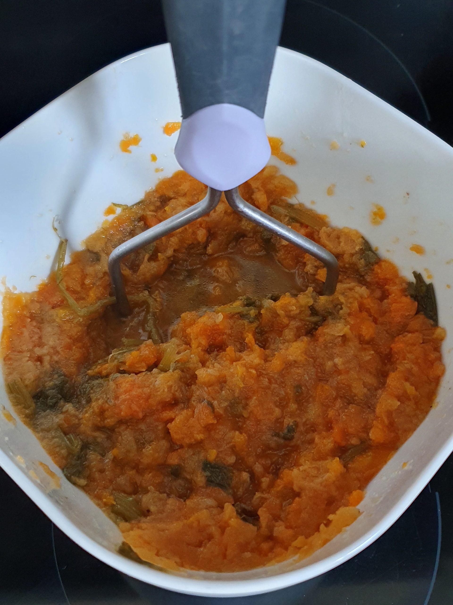 Réchauffer le pot au feu à feu moyen pendant 15 minutes, il est plus facile d'émietter la viande chaude que froide. Récupérer la viande, la dégraisser, enlever les os et émietter la chair à la fourchette. Récupérer les légumes. Les écraser avec un presse purée. Mélange les légumes avec la viande, ajouter un peu de bouillon pour.