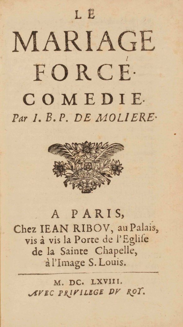 MOLIÈRE (16221673). Le Mariage forcé. Paris Jean Ribou, 1668. In12 (142 x 85 mm). Reliure