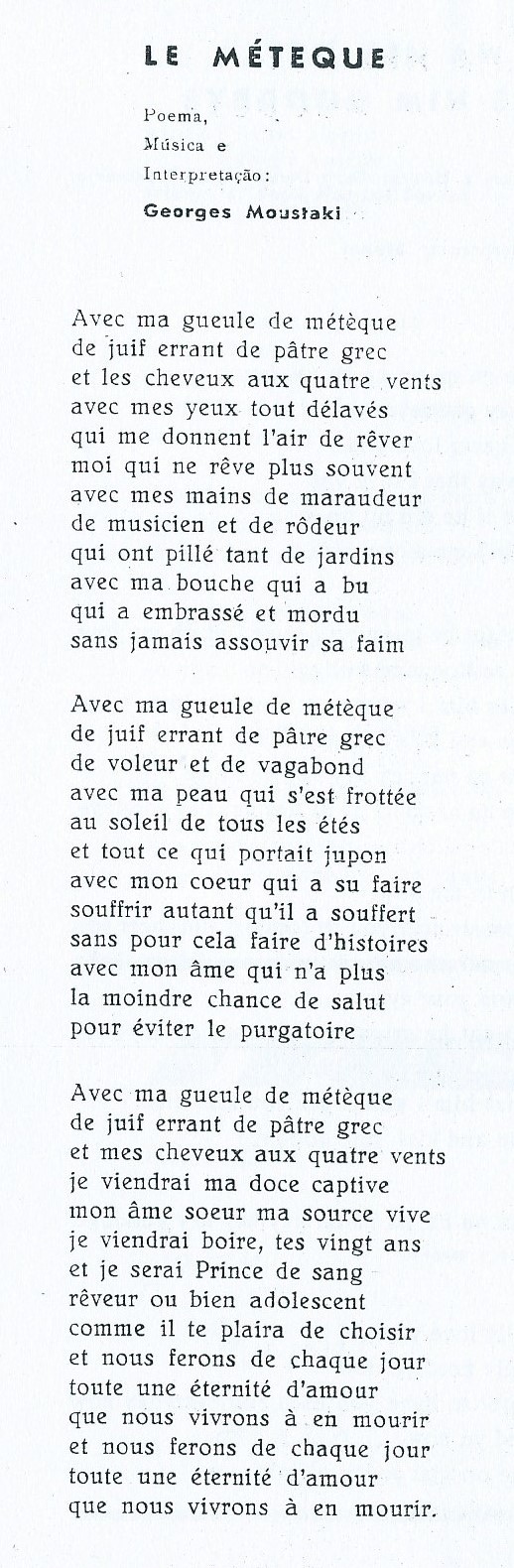 Avec ma gueule de métèque, de juif errant, de pâtre grec, De voleur et de vagabond. Avec ma peau qui s'est frottée. au soleil de tous les étés et tout ce qui portait jupon. Avec mon cœur qui a su faire souffrir autant qu'il a souffert, Sans pour cela faire d'histoire. Avec mon âme qui n'a plus.