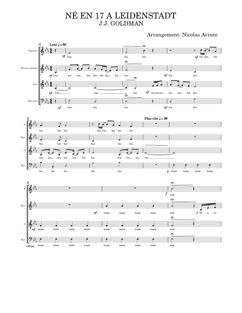 Né en 17 à Leidenstadt JeanJacques Goldman Sheet music for Soprano, Alto, Baritone, Mezzo