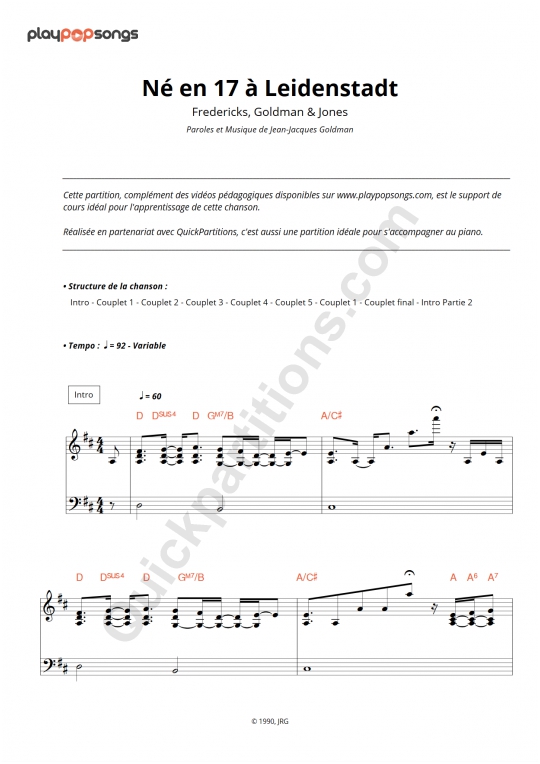Chanson : Né en 17 à Leidenstadt, Artiste : Jean-Jacques Goldman, Type document : Partitions (paroles et accords) Partitions. Nouveautés. Top 50. Sélection aléatoire. Dernières consultées. Recueils. Recueils persos. Et si j'é tais ne en 1 7 a Leiden stadt. Né en 17 à Leidenstadt - Live Un tour ensemble 2002. Jean-Jacques Goldman.