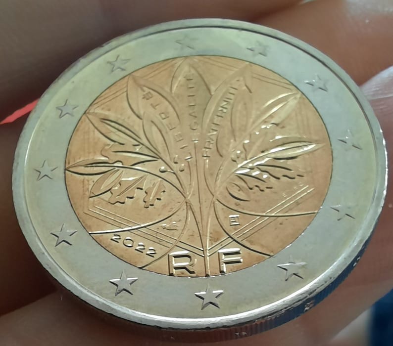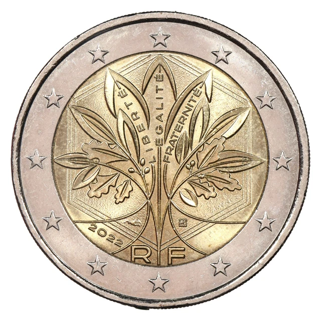 Description du produit. Pièce officielle de 2 euro France 2022 représentant l'Arbre de l'Union. La partie interne représente l'arbre de l'Union, symbolisant la vie, la croissance et la pérennité, figure au centre d'un hexagone. La devise républicaine « Liberté, Égalité, Fraternité » est positionné en haut des feuilles, en.