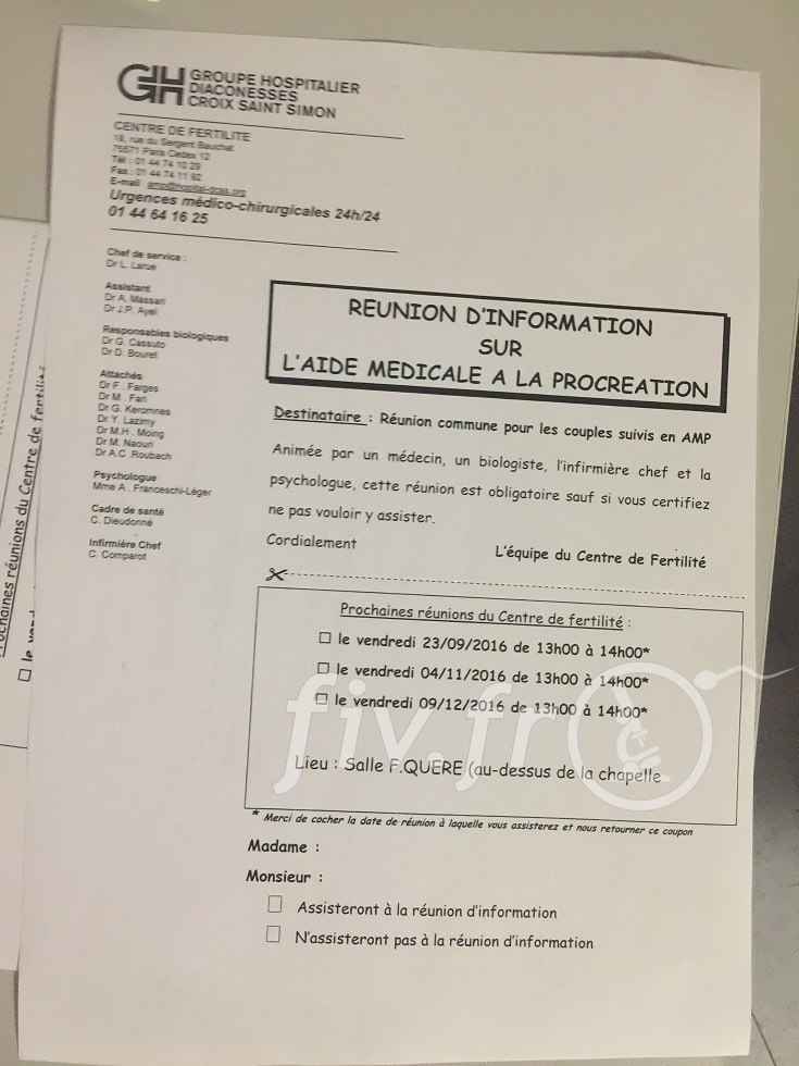 Centre de fertilité : Groupe Hospitalier Diaconesses Croix Saint-Simon. 18, rue du Sergent Bauchat - 75012 Paris. Standard : 01 44 74 10 10. Mail : amp@hopital-dcss.org. Laboratoire Drouot. 21, rue Drouot - 75009 Paris. Tel : 01 45 23 10 45. site web laboratoire Drouot.