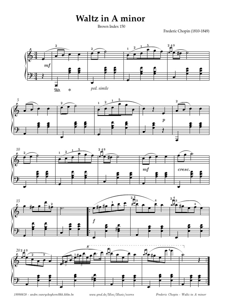 Mais cette fois, et pour la toute première fois, il s'agit bien d'une formation sur une oeuvre précise, La valse en la mineur de Chopin.. Partition de la Valse en la mineur de Chopin (Vierge) 115 ko; Chopin-Valse en la mineur-Accords.pdf. 118 ko; Chopin-Valse en la mineur-Nuances.pdf.