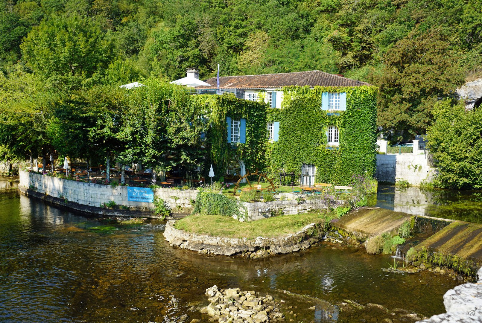 Dordogne / Brantôme, la Venise du Périgord. Au milieu d'un paysage bucolique se niche le village de Brantôme édifié autour de son Abbaye et enlacé par son cours d'eau, La Dronne. Rechercher un hébergement. 2 personnes. A l'ombre d'une falaise, le bourg est un îlot de pierre au cœur d'un paysage verdoyant.